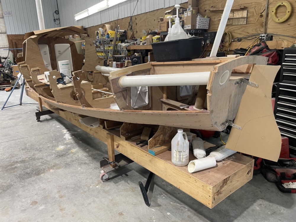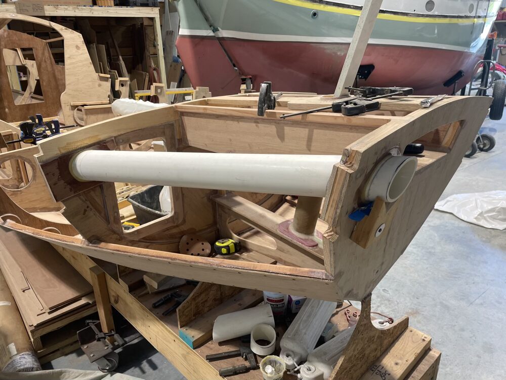 After finishing house repairs and yard beautification for a visit from the in-laws I decided to work on the boomkin tube. I changed this from the designed plywood box to a 3″ PVC pipe for lack of maintenance inside and increased space in the aft compartment. After hole sawing and die grinding the holes I screwed on some 2×4 V blocks to hold the tube centered. I glued the tube in place with GFlex thickened with 404 after sanding to 80 grit, alcohol wiping, and flame treating. It’s pretty impressive how well the epoxy bonds to the PVC compared to a test piece with factory finish.