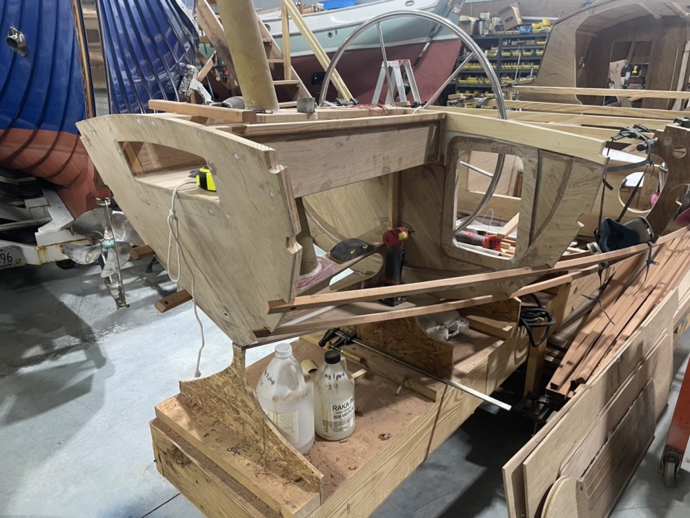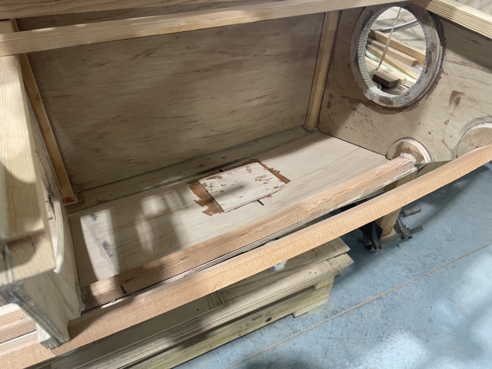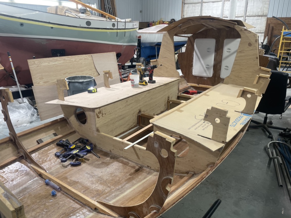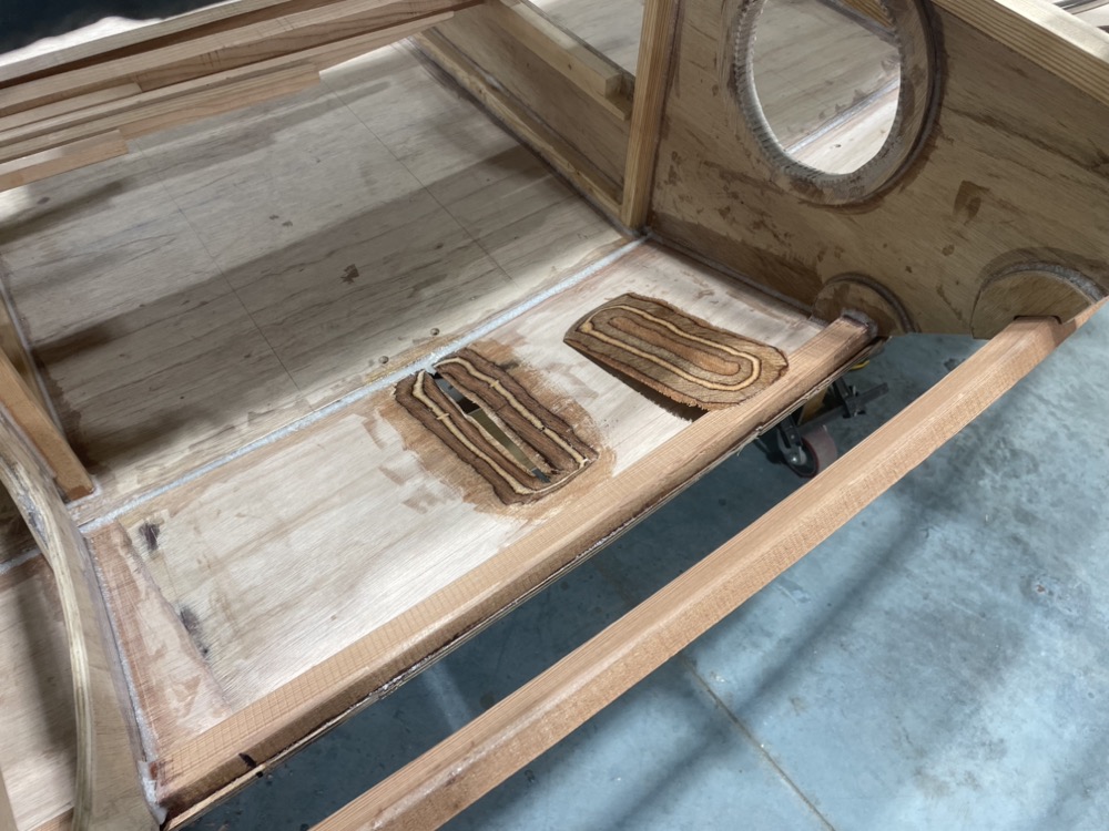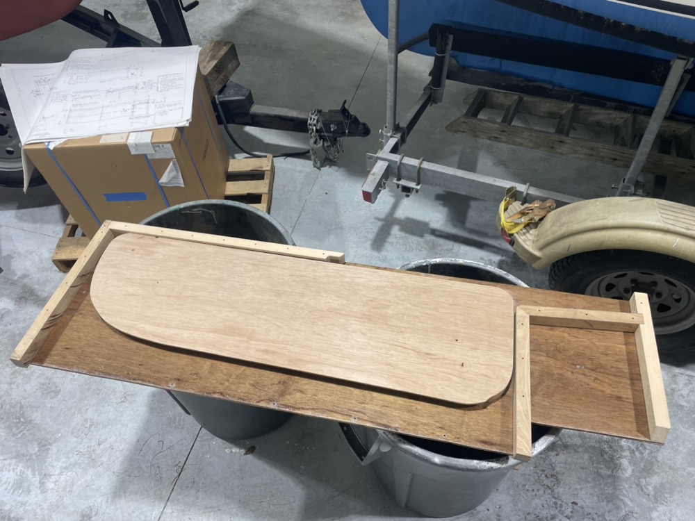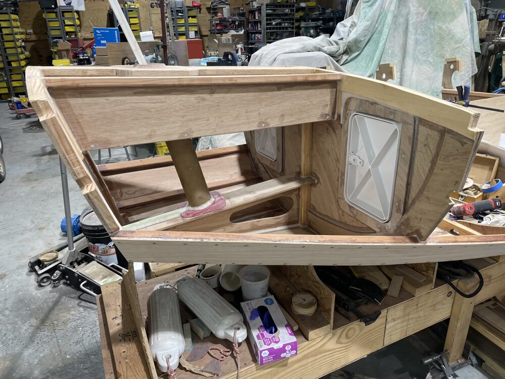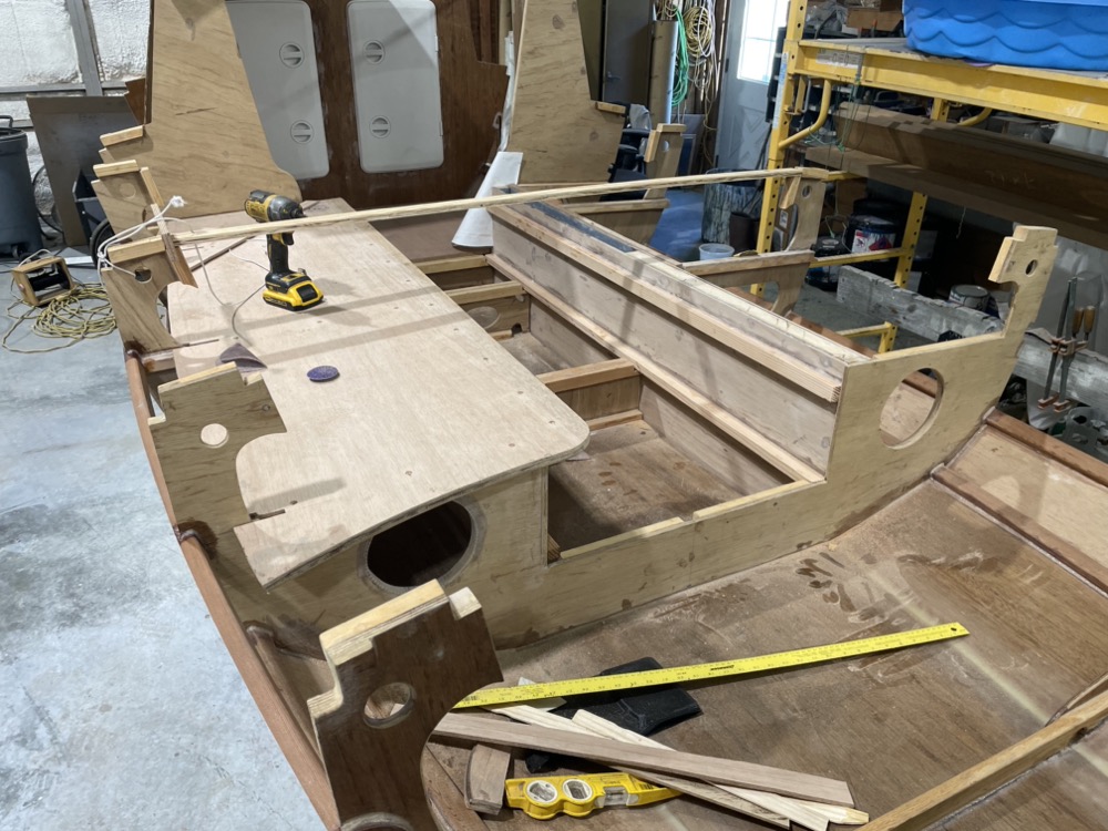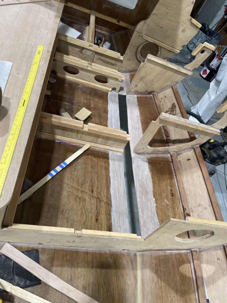 Here’s the port seat front installed and the top dry fit. The centerboard case makes up the front of the starboard seat.