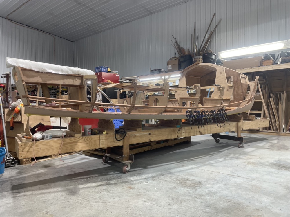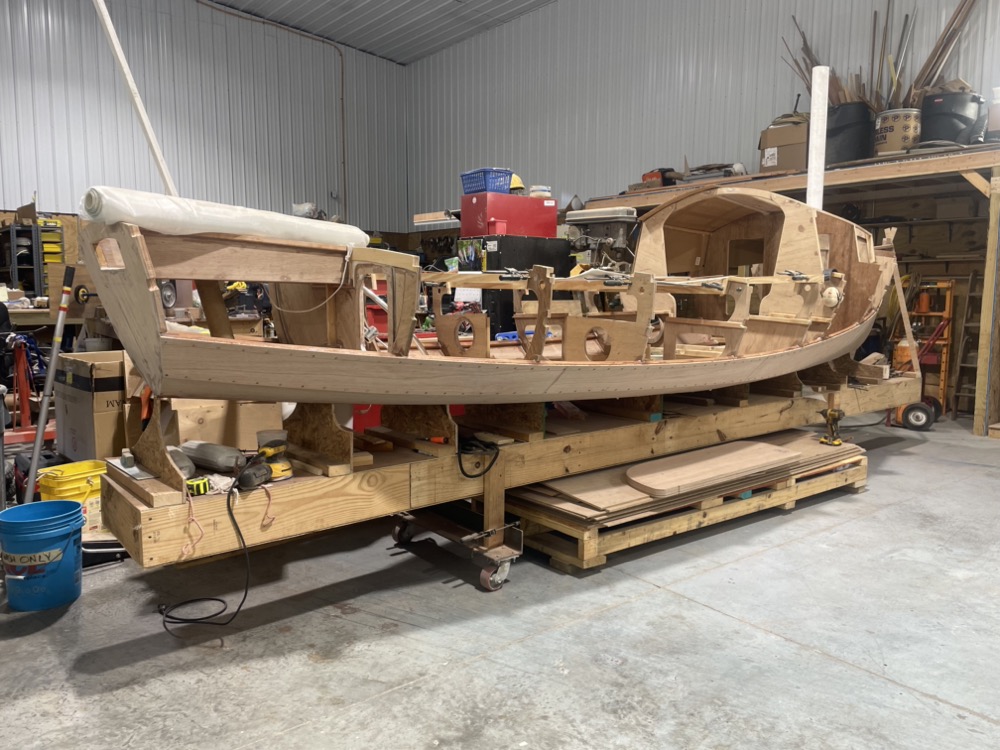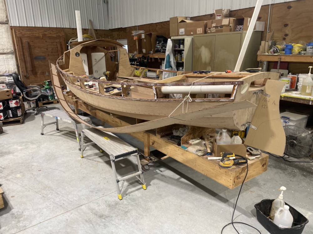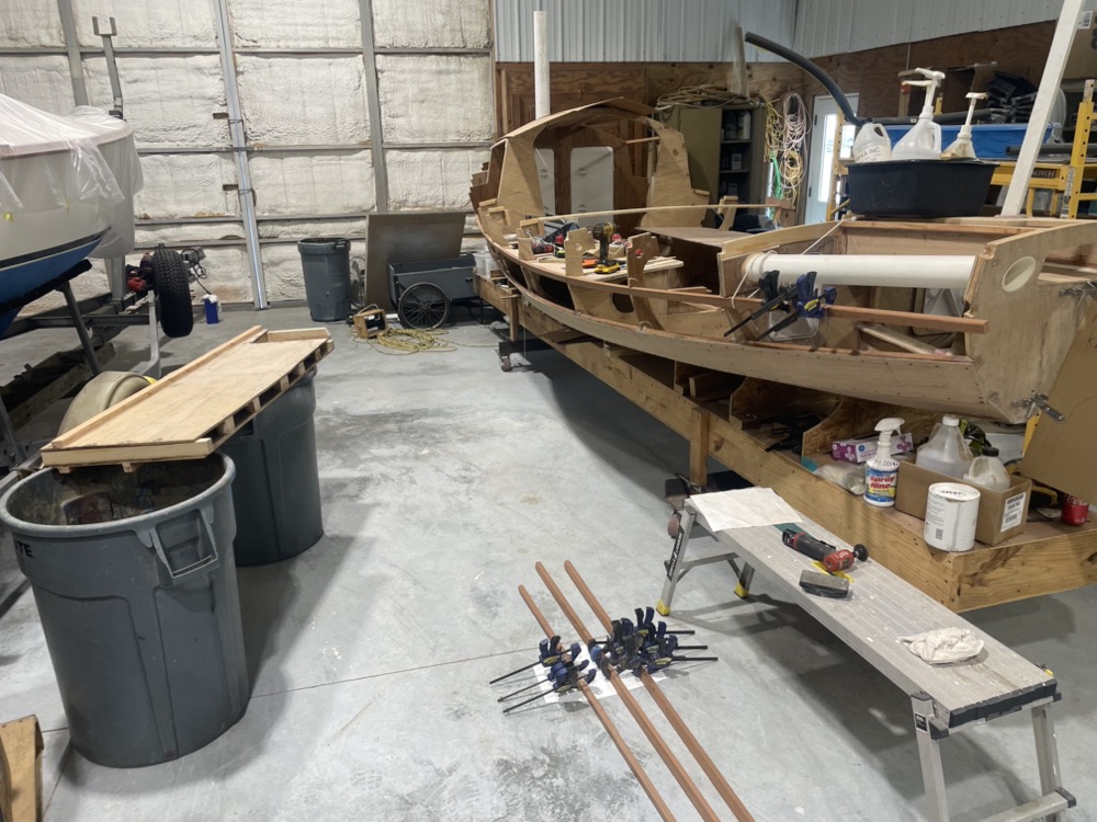 Eventually I got the two lowest pairs of planks epoxied on so now the hull is stiff enough to start finishing the inside while I can still lean inside easily. Once the inside is done I’ll put the remaining two pairs of planks on and the deck.