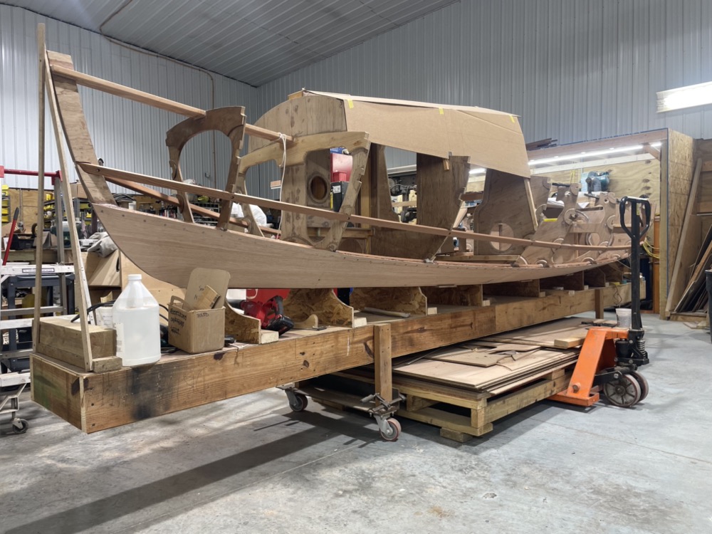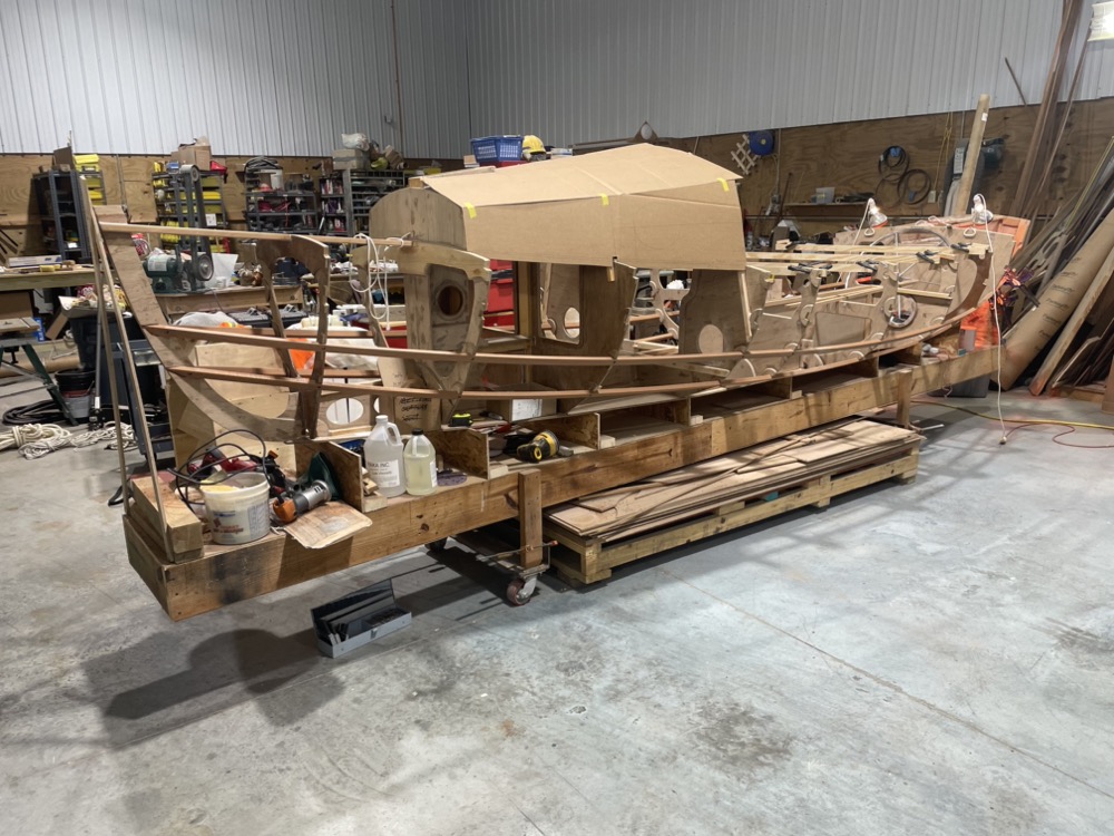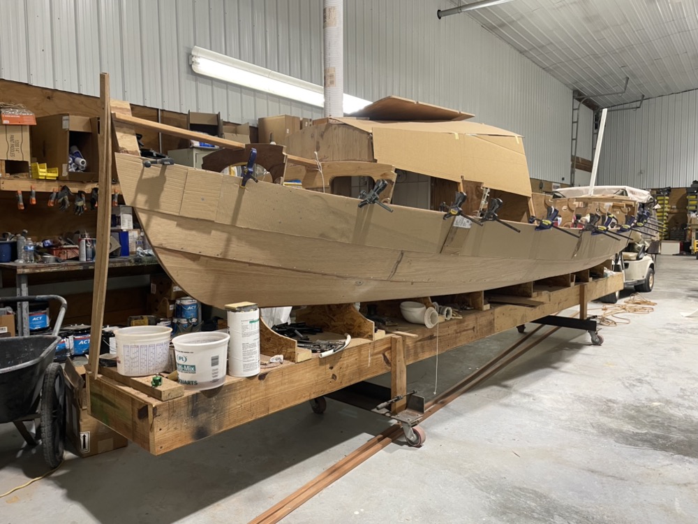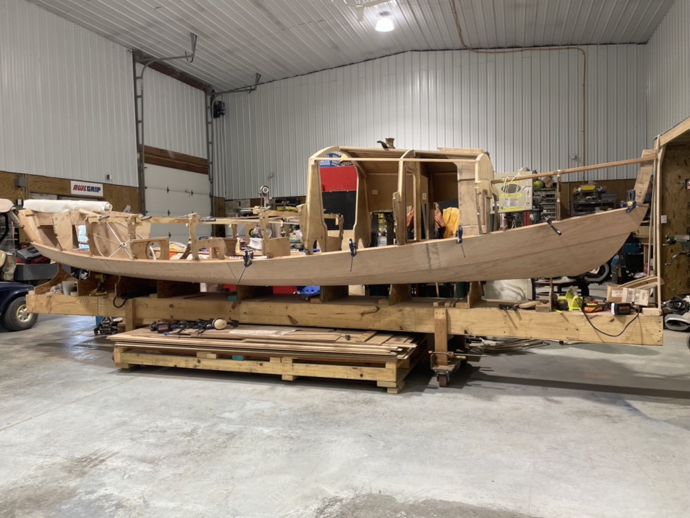 Finally the strips are in and fairly fair. Next up I’ll build some cardboard plank patterns, scarf my plywood, and put the bottom two pairs of planks on. I trimmed the OSB bottom panel supports so the planks can lap over the bottom without interference. I figure I’ll leave the plywood oversize and scribe it to the bottom panel.