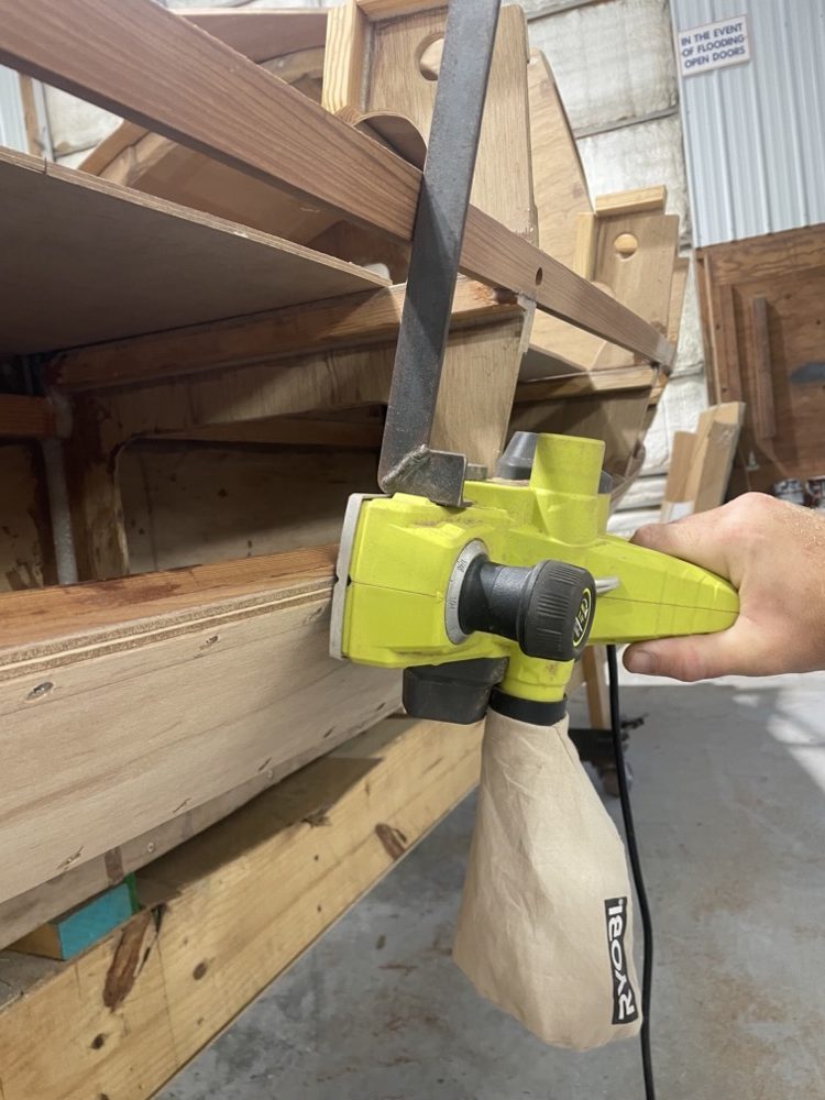 I decided to add the next plank instead of fiberglassing the inside, so that means I need to bevel the stringers so the planks will lay flat. I briefly tried a hand plane and decided that was way too much work and too slow, so I rigged up a guide on my electric planer which did a really nice job. The bar is level with the sole of the plane and rides along the next stringer to cut a rolling bevel on the stringer and plank below. I gave this planer the full Louis Sauzedde treatment and it’s really been a nice tool to use. (https://www.youtube.com/watch?v=_a1HCqK5i-A)