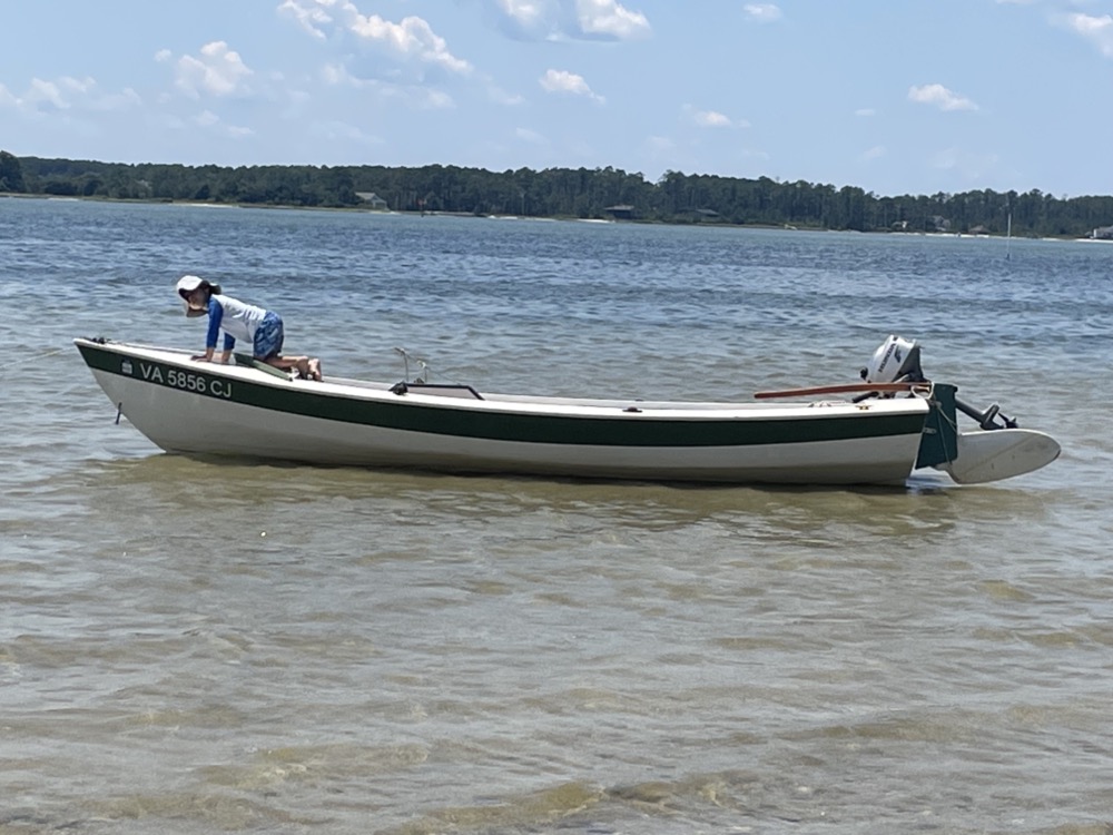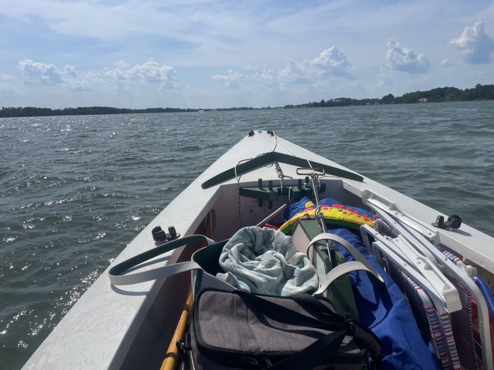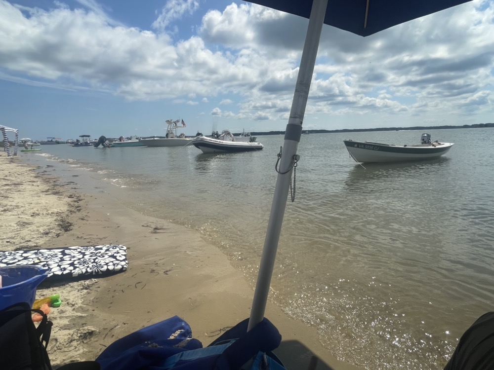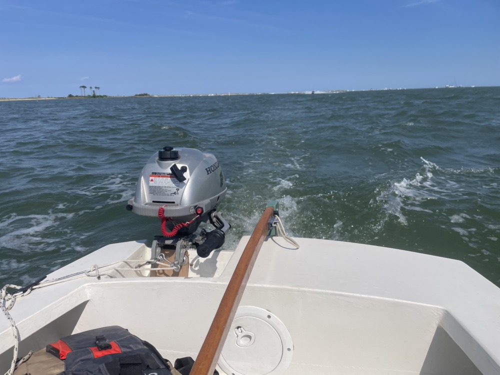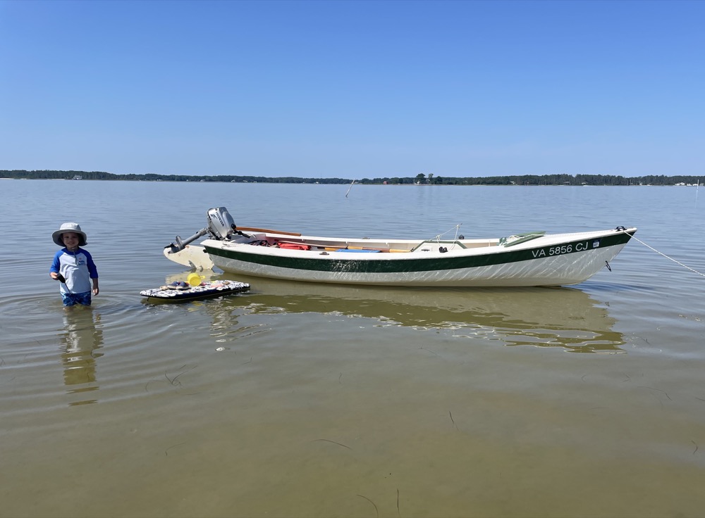 My wife, son, and I took the boat out for the first time this year! It was a quick 2.5 mile motor over to the sandbar below Gwynn’s Island. I used my new (to me) Honda 2hp outboard and it did a great job compared to the British Seagull or my trolling motor experiments. I averaged 6.2 mph although the wind was favorable in both directions. We left the dock around 8:30am with a 5 mph breeze from the west, flat calm for an hour around 11am, then the wind backed to the south east and picked up to 10-15 mph with higher gusts.