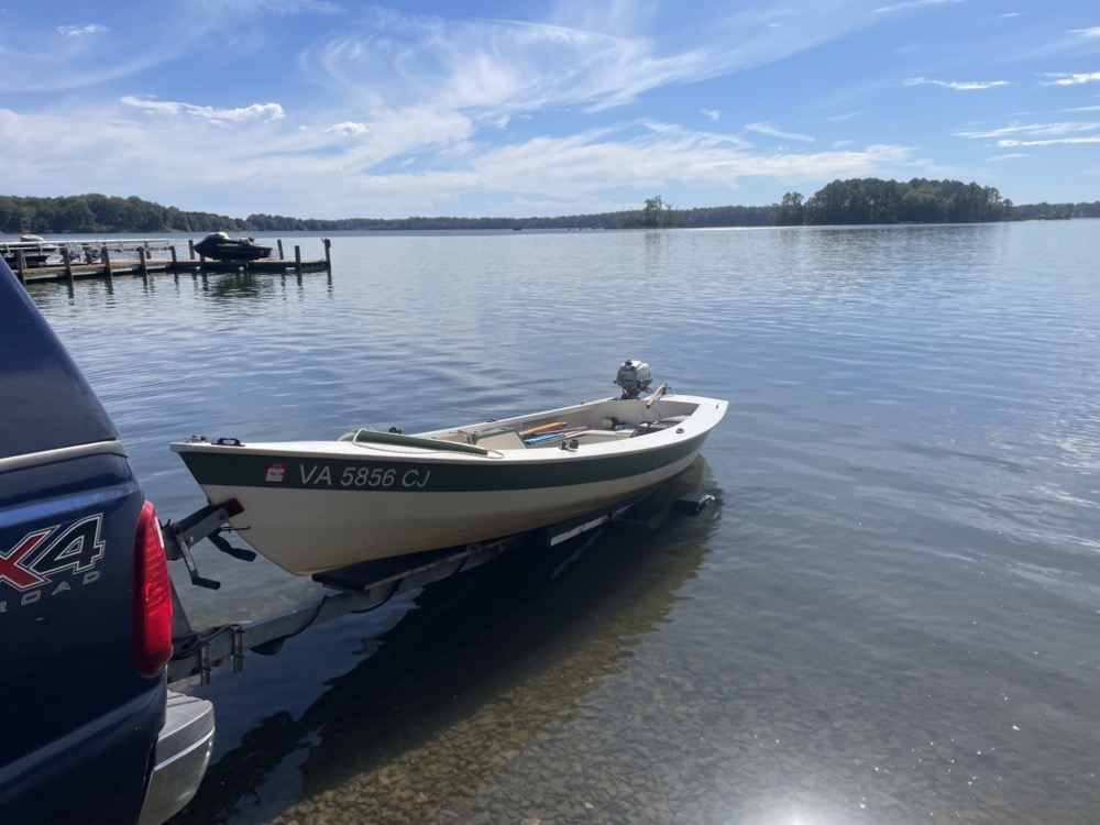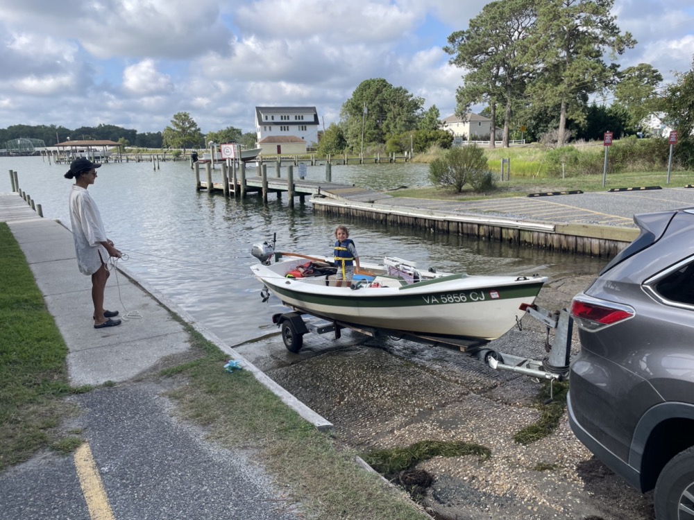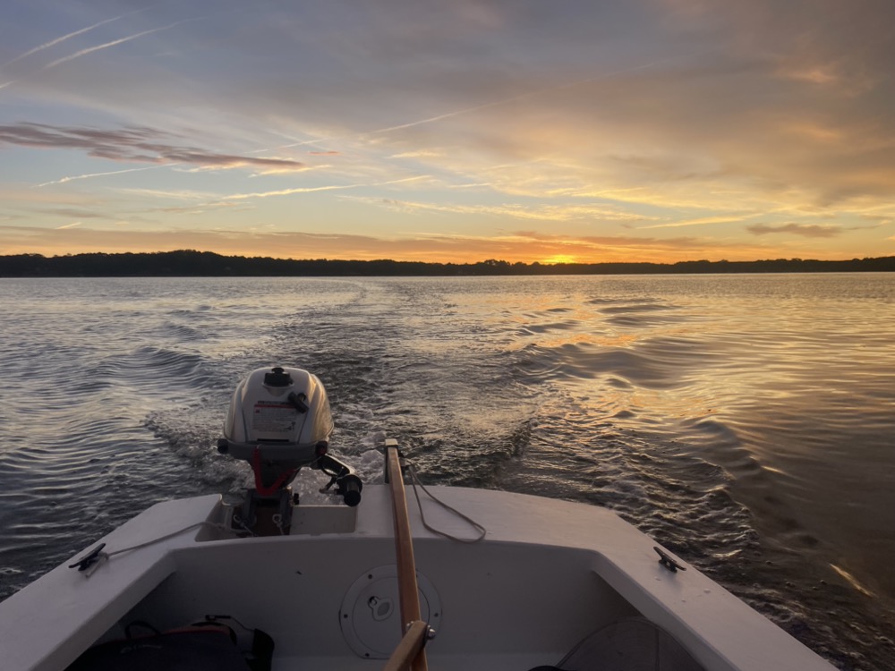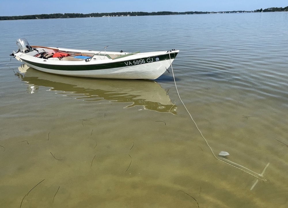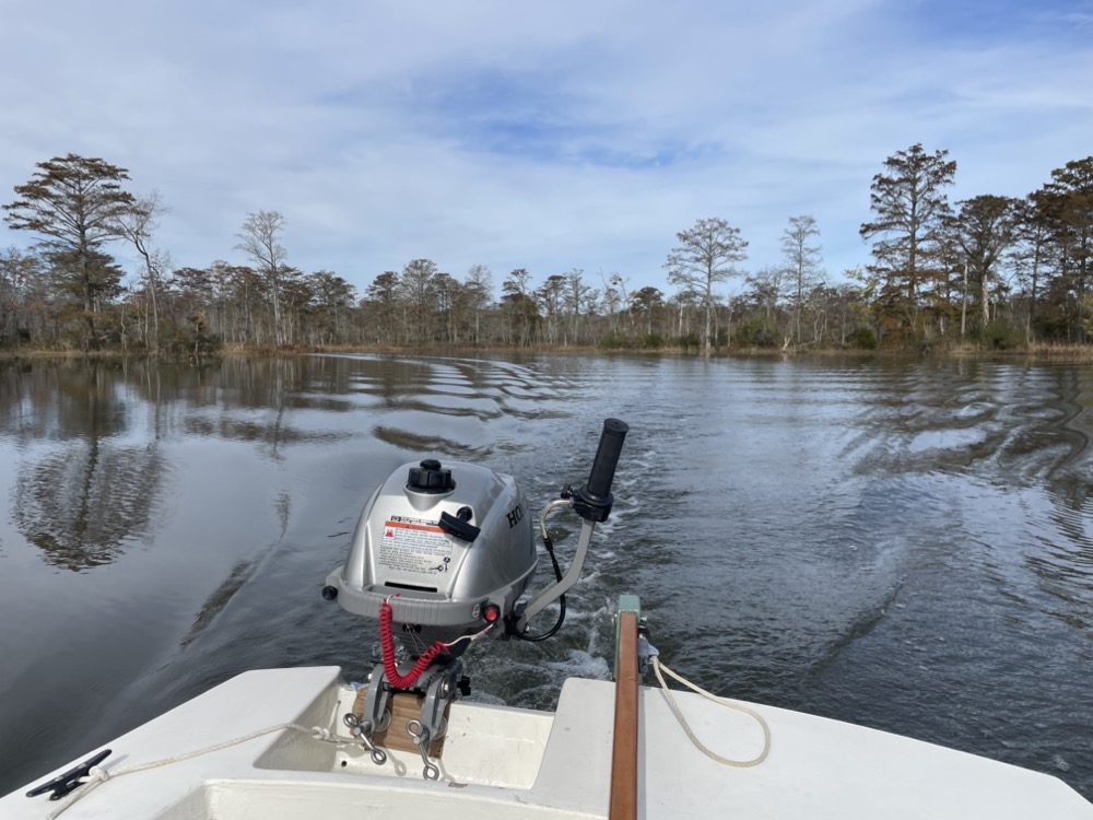 My wife, son, and I took the boat out for the first time this year! It was a quick 2.5 mile motor over to the sandbar below Gwynn’s Island. I used my new (to me) Honda 2hp outboard and it did a great job compared to the British Seagull or my trolling motor experiments. I averaged 6.2 mph although the wind was favorable in both directions. We left the dock around 8:30am with a 5 mph breeze from the west, flat calm for an hour around 11am, then the wind backed to the south east and picked up to 10-15 mph with higher gusts.