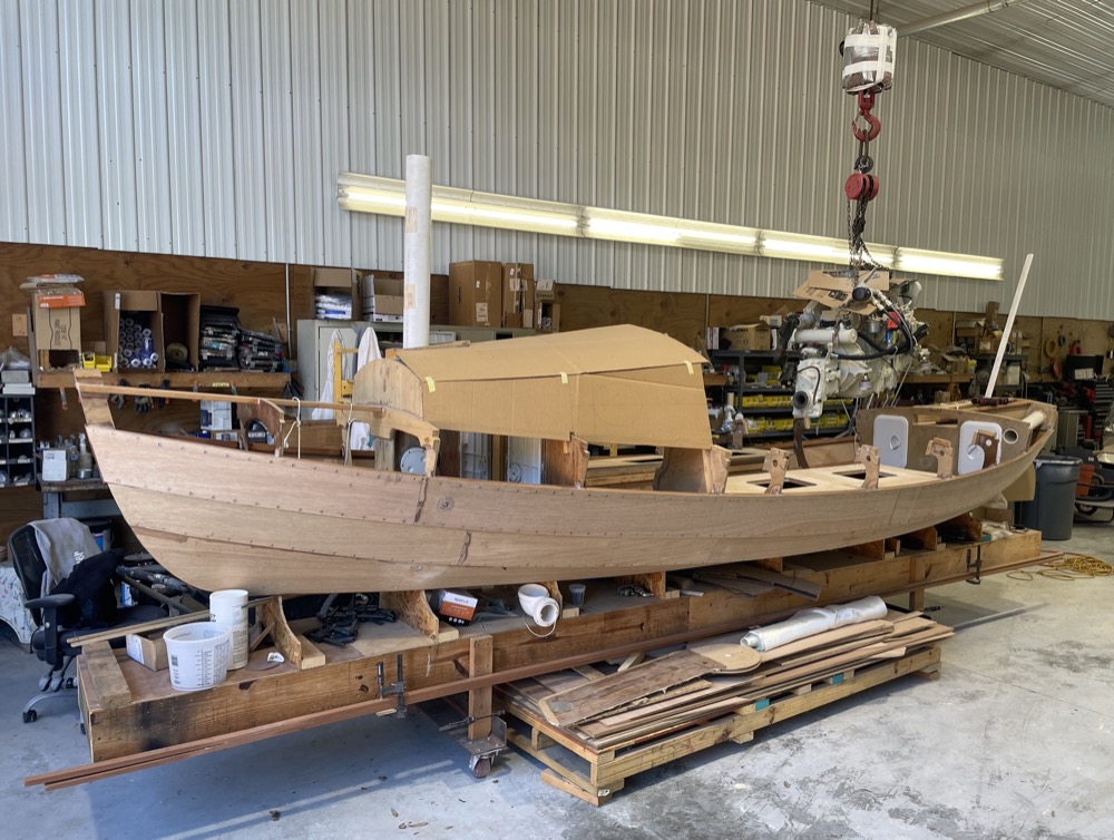 Not being the biggest fan of rowing, my buddy and I tried to set a Universal 5432 engine into the boat to see how it’d fit. It looks like it’ll be a little large, but the V drive should help with the angle.