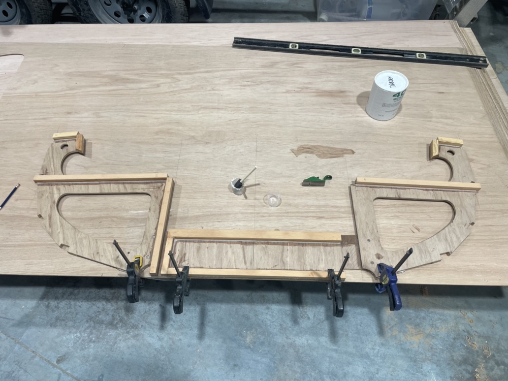 Using the cardboard pattern I scarfed up some ply to fit. After tracing I jigsawed about an inch oversize because I wasn’t sure if the cardboard would distort when I laid if flat. To clamp the scarf joint I used a group 24 battery sitting on top of a 2×4 wrapped in packing tape.