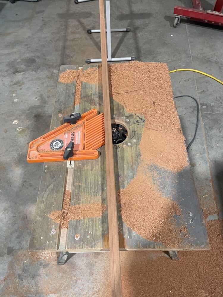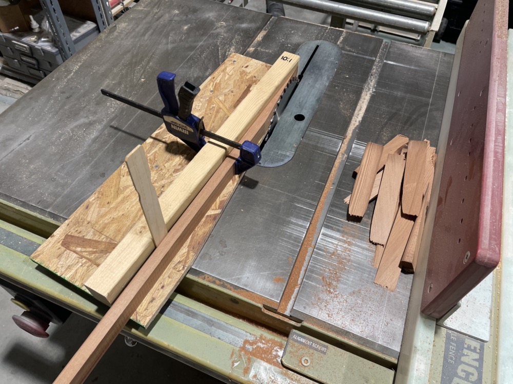 I’m going to need to do a lot of scarfing so I made a 10:1 jig. I think the fence might be a bit bowed or something because I found I needed a shim to keep the strips tight up by the blade.