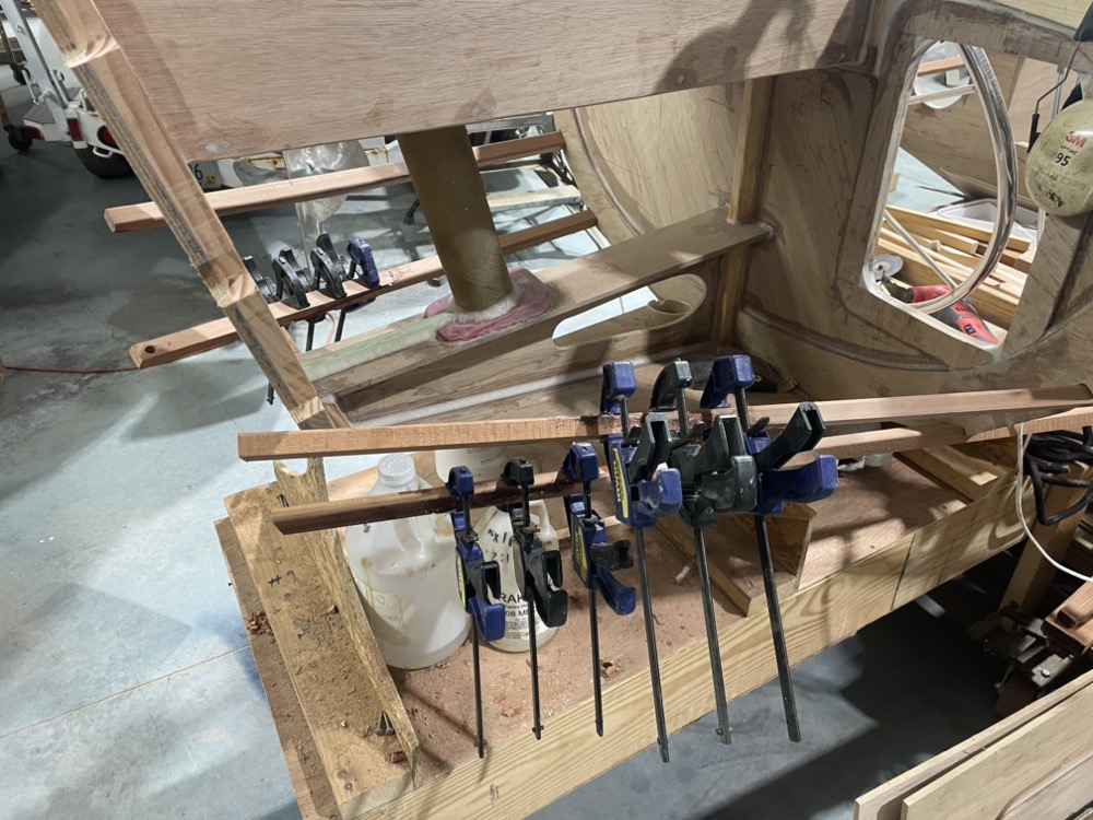 Got the bottom two pairs screwed into place. I had to do some beveling on the notches in the frame with a burr in a die grinder and one of the notches seems to be nearly an inch off to get the batten to lay fair. After dry fitting I’d let the forward half spring out and glue them in place. Then the next day I’d do the rear half of a stringer. I guess it helps prevent distortion, but mainly that’s all I could get done during a lunch break!