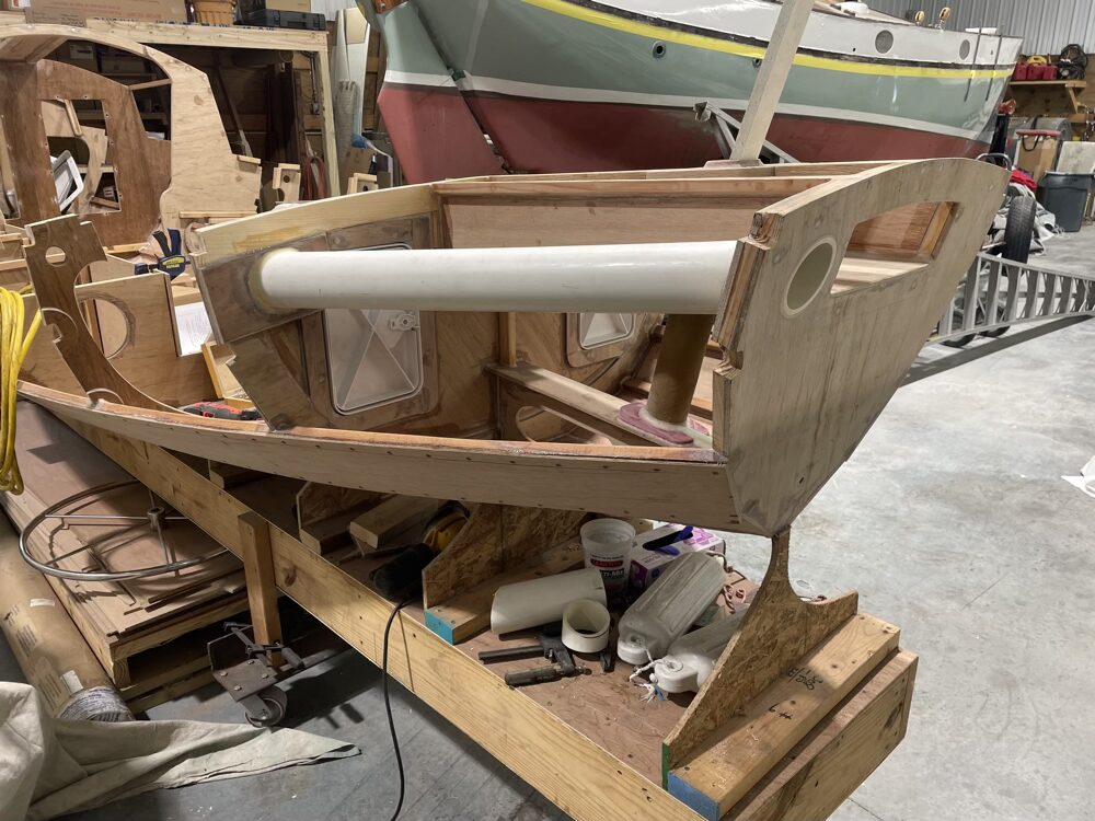 After the epoxy I packed into the holes cured I put a big fillet around the tube and cut and sanded the ends off flush. My plan is to epoxy a collar onto the boomkin so it will mate up to the angle of the transom which will keep it from sliding forward. Then a pin or some other mechanism in the cockpit area will keep it from slidding backwards. I’m thinking the boomkin will be hollow and the mizzen sheet will come through to a cam cleat mounted right onto the heel of the spar.