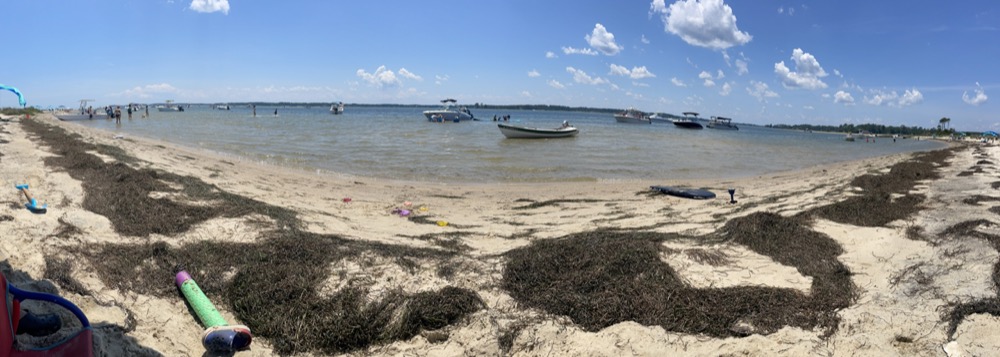 Friday evening I asked Henry what he wanted to do on Saturday and he said he wanted to go back to the sandbar. So Saturday morning we got the boat loaded up and headed back out there! I let him steer while we idled through the no wake zone which he enjoyed. He hasn’t quite figured out you need to move the tiller opposite of where you want to go, but we’re working on it! As we got closer to the island we saw a ton of kayakers and paddleboarders. I later found out it was an organized circumnavigation of the island.