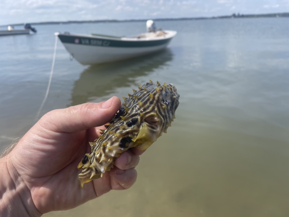 Out at the beach this striped burrfish washed up on shore in front of our tent. I tried to get Henry to hold him but he was “too spiky.” I put him back in the water and he eventually fluttered off. Apparently they’re pretty poor swimmers.